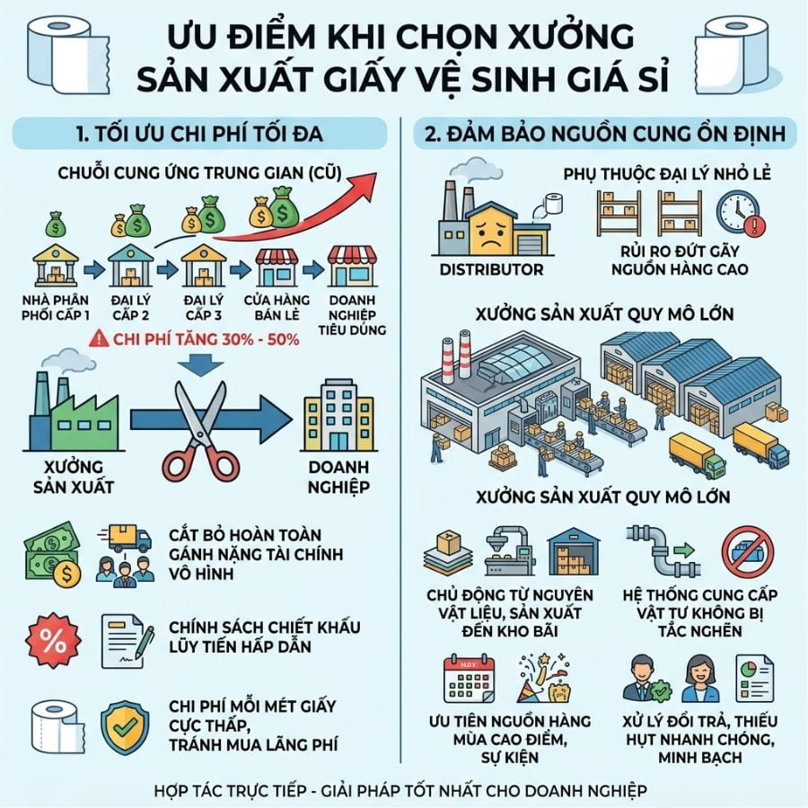 Doanh nghiệp của bạn đang phải gánh chịu những khoản chi phí khổng lồ hàng tháng cho các loại vật tư tiêu hao? Việc mua giấy vệ sinh qua 2-3 lớp đại lý trung gian không chỉ khiến ngân sách bị đội lên đáng kể mà còn tiềm ẩn rủi ro về nguồn hàng thiếu ổn định và chất lượng trôi nổi. Đặc biệt tại các tòa nhà lớn, khu công nghiệp hay chuỗi nhà hàng, việc tìm đúng xưởng sản xuất giấy vệ sinh giá sỉ không chỉ là bài toán mua bán thông thường, mà là chiến lược sống còn để tối ưu hóa chi phí vận hành. Bài viết này sẽ giúp bạn bóc tách những bí mật của ngành giấy, từ đó tự tin kết nối trực tiếp với nhà máy sản xuất tận gốc, cắt giảm tối đa chi phí không cần thiết và nâng tầm chất lượng dịch vụ của doanh nghiệp.